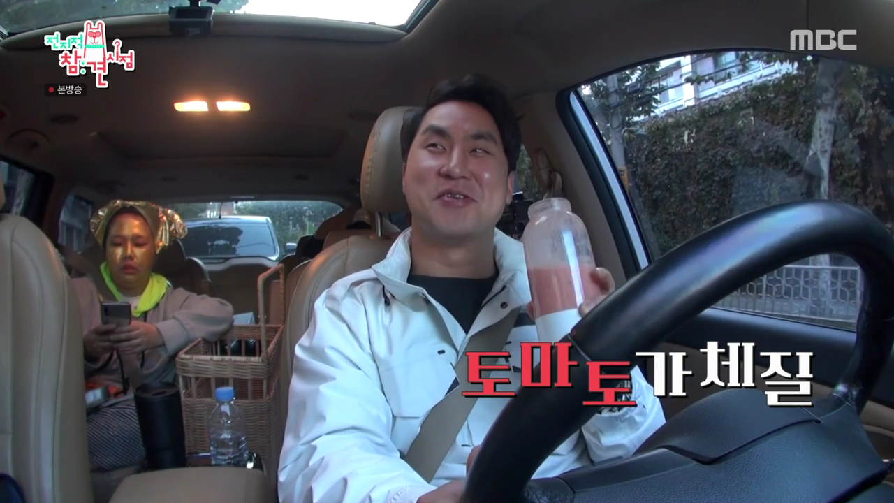 홍현희의 매니저가 마주스를 안좋아해서 마 대신 토마토를 넣고 주스를 만들고 있어요. 집이 아니라 움직이는 자동차 안이라서.. 어떻게 주스를 가나 했더니.. 충전해서 쓰는 믹서기 같네요.